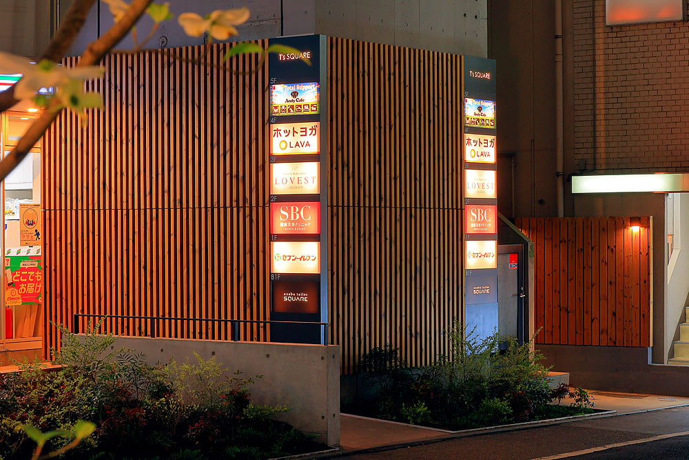 柳小路のデザインモチーフとなっている木格子をエントランス周りの動線部に施し、街区内の建物群として一体感のある景観整備を試みた。木格子は防腐性能が高く、反りなどの心配が少ない杉のサーモウッド(高熱乾燥処理)を採用した。また、地下階、1階、2階以上へのエントランス動線を整理し、各テナントへのアクセス性とテナント空間の利便性の向上を図った。