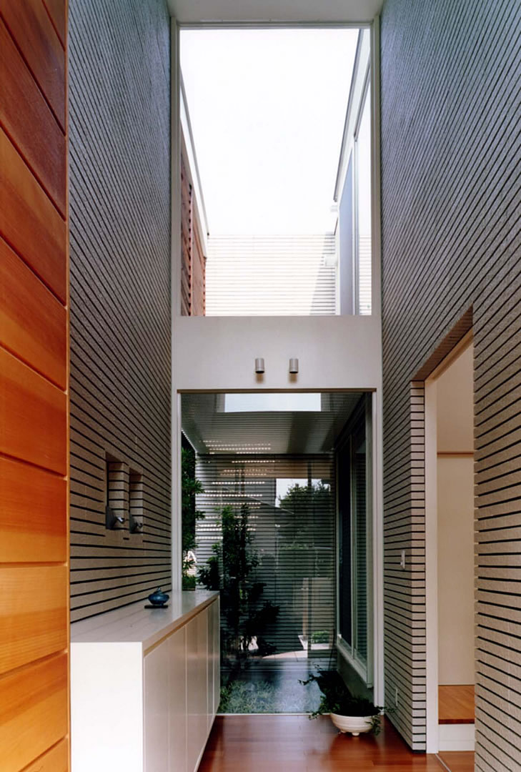 玄関から奥の坪庭と2階のテラスを見る