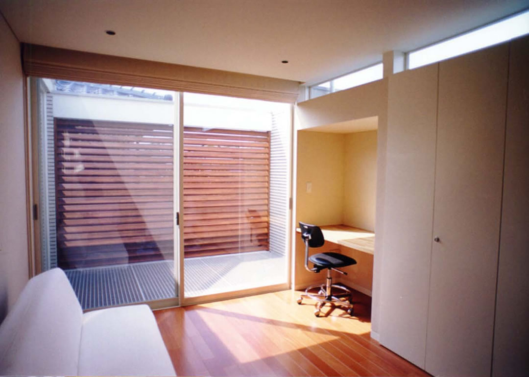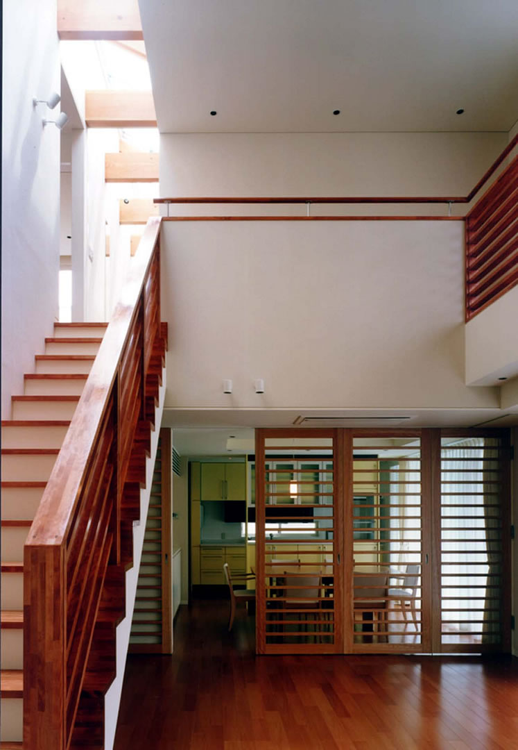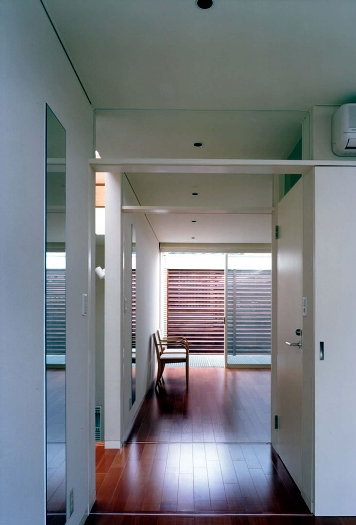 典型的な郊外の住宅地に建つ住宅。周辺のどの家も南向きに庭を配置した方向性を持っている。この住宅では南面の庭だけではなく、東西に小さな坪庭と大きな窓をそれぞれ配置して、隣地境界側の敷地を積極的に活用しようと試みた。東西の坪庭には、敷地境界側に目隠しとなる植栽や木製ルーバーを設置し、各々のプライバシーを確保した。坪庭に面して大きな窓を配することができ、北側の居室にも十分な採光と通風が保たれている。また、坪庭の上部に設置したFRPグレーチングの床は、2階居室のプライベートな屋外テラスを創出するとともに、下部への採光を可能にしている。