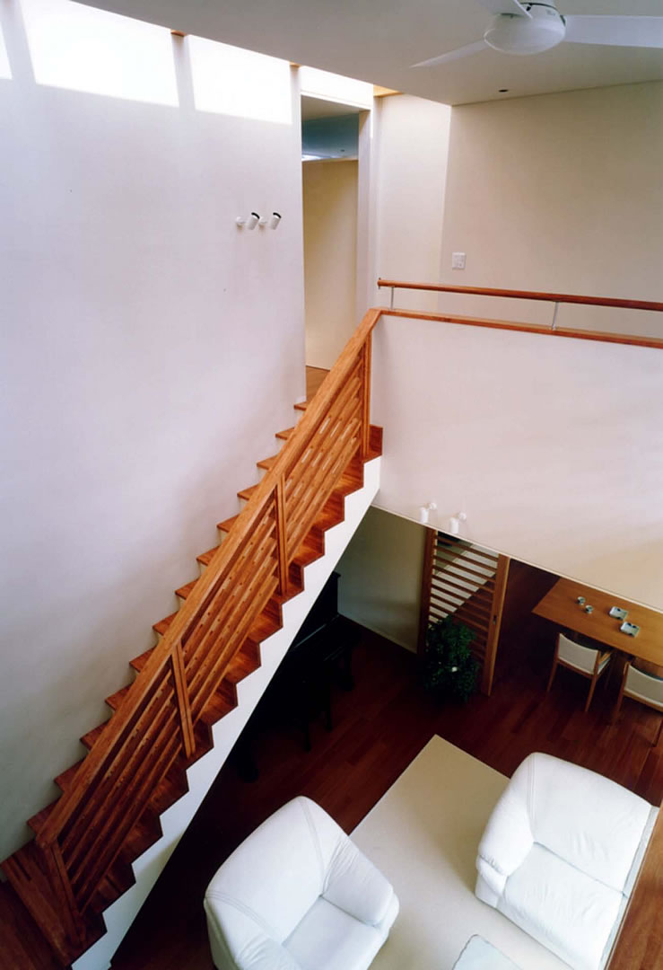 階段上部のトップライトからの光が差し込む